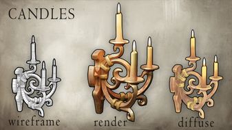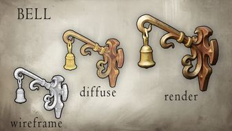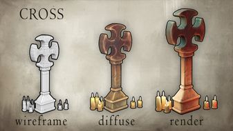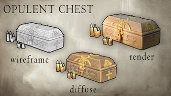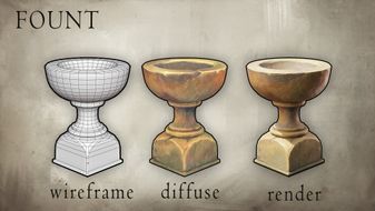 I painted individual details such as the fount or the ornamented chest very carefully. The lighting and specularity washed out the custom painting a bit but my colors are still visible underneath the realistic textures of the stone, metal and wood. I have noticed that it is because of projects like this I understand materials better. This is one of the reasons why I stray away from Substance Painter.