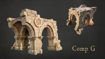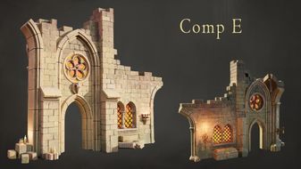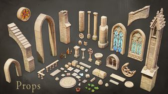 Such modularity is in 3D models - like bricks, plants and columns repeating in various arrangements and in the textures - like a simple stone wall texture that appears here and there. Objective was to create several small compositions of gothic ruins that users can scatter throughout their scene. They fit each other and yet they all are unique pieces of architecture.